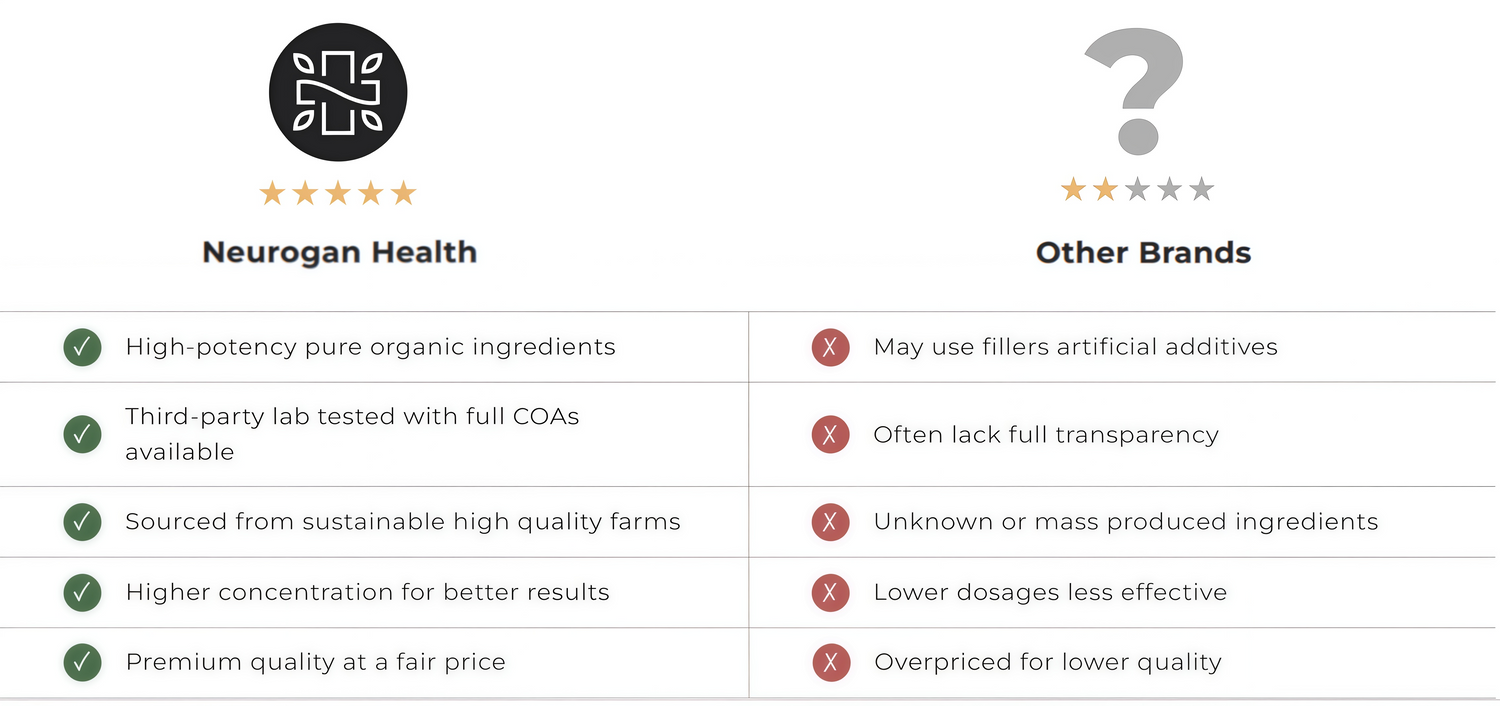 At Neurogan Health, we believe in transparency and quality. Our products are crafted with the highest standards, ensuring purity, potency, and effectiveness—without unnecessary additives or shortcuts.